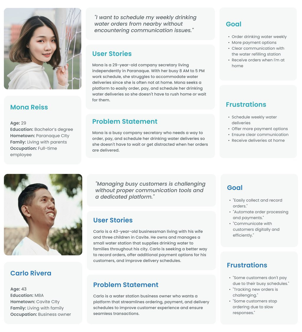 A platform that simplifies ordering, payment processing, and delivery scheduling for water refilling stations. In that case, business owners like Carlo and busy customers like Mona will experience improved efficiency, smoother transactions, and greater satisfaction with their service, leading to higher customer retention and business growth.