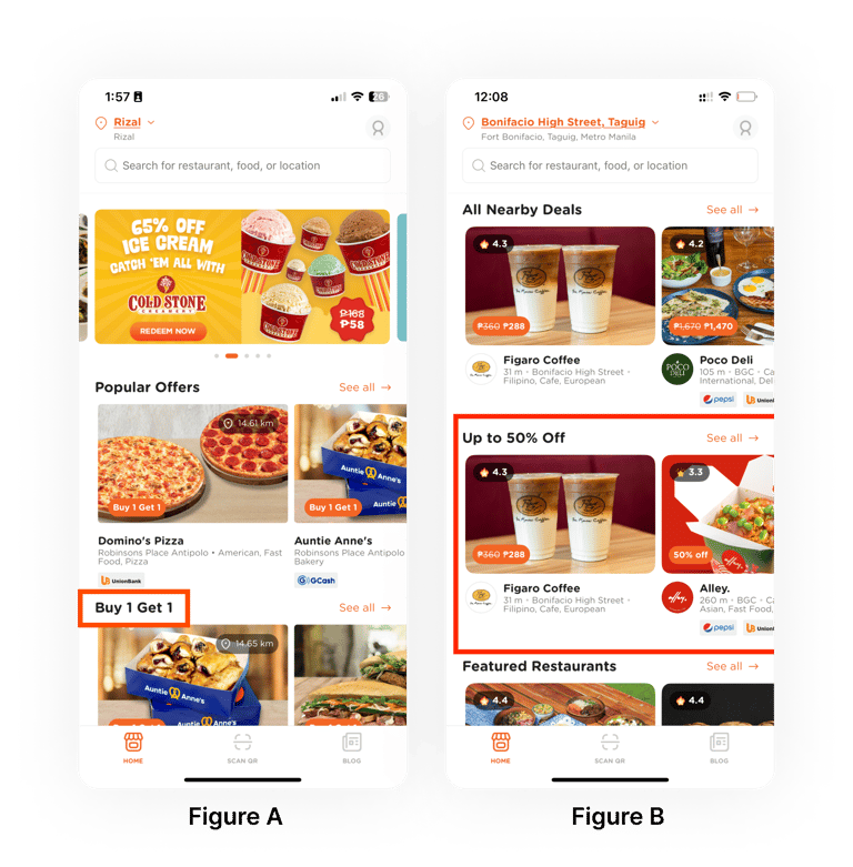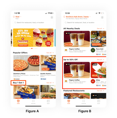 Figure B: A new homepage section for percentage-based vouchers was introduced based on research. This section enhances user experience by simplifying deal discovery and reducing scrolling.