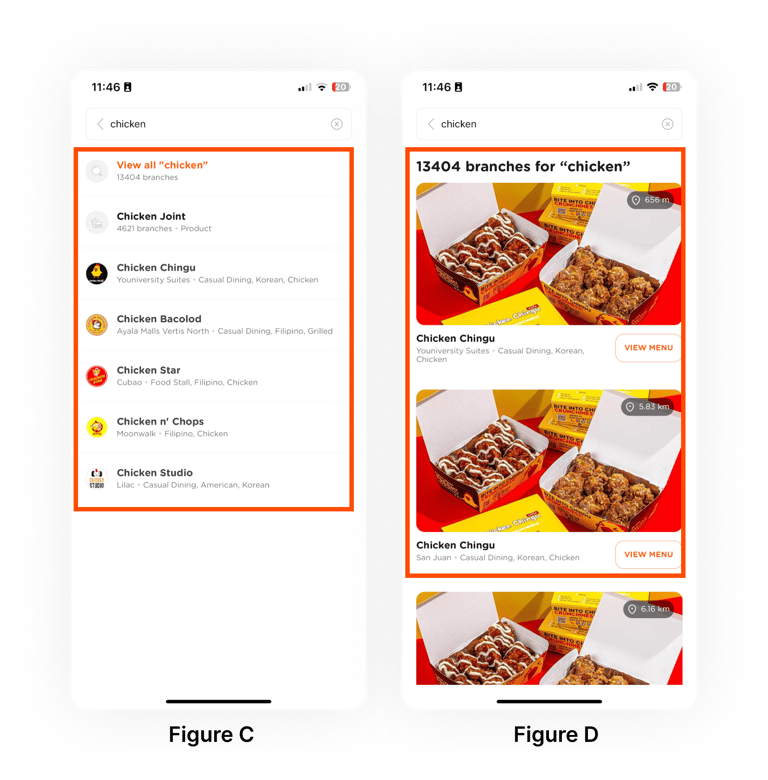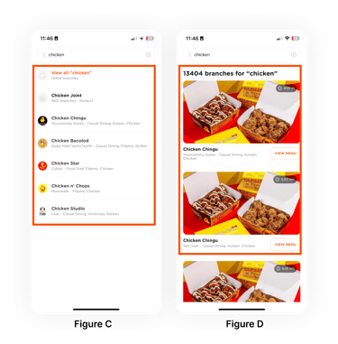 Figure D: Users find it hard to narrow down results and find where they want to eat because there is no way, such as filters at the top. Showing multiple branches of the same restaurant also adds unnecessary clutter, especially when users want nearby options.