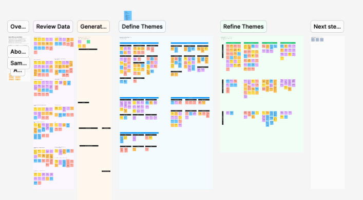 After conducting user interviews and user testing, I gathered and analyzed the data using thematic analysis with the help of FigJam for team collaboration. Thematic analysis is a qualitative research method focused on identifying, analyzing, and reporting recurring themes within the data. This method allowed a deeper understanding of user behaviors, needs, and pain points.